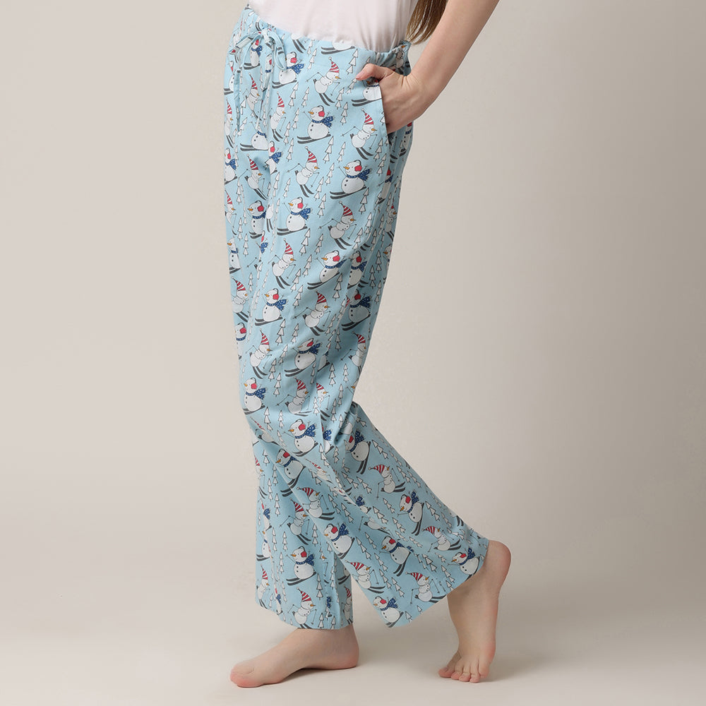 Jolly snowmen skiing through a forest of quirky white trees, all set on a frosty blue background. With cheery hats and polka-dot scarves flying, it's a snowy adventure full of winter fun!