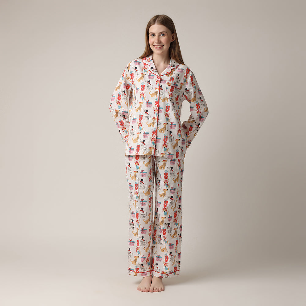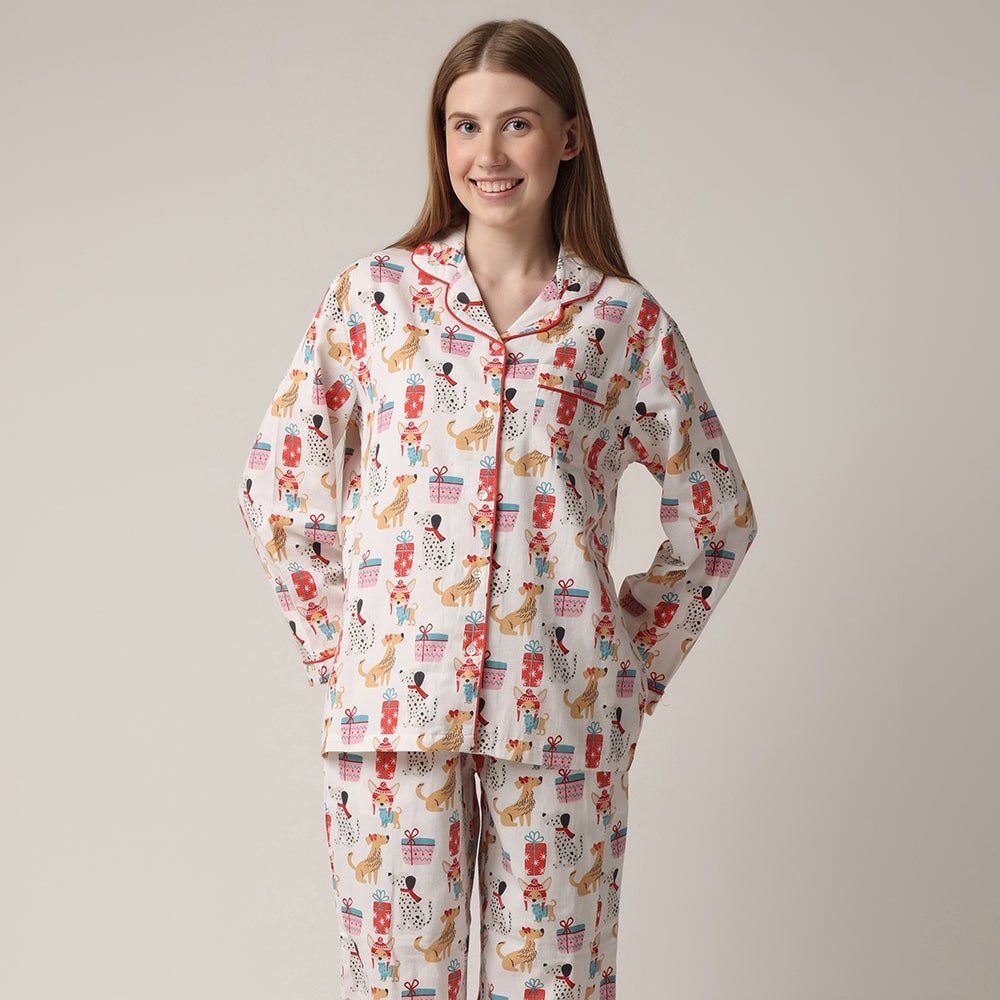 This cheerful holiday print is a pup-lover's dream! Adorable dogs in scarves and hats frolic among colorful gift boxes in red, pink, and teal—spreading tail-wagging festive joy!