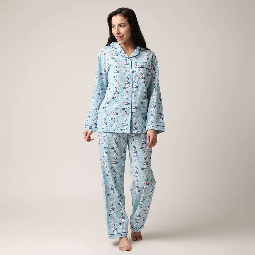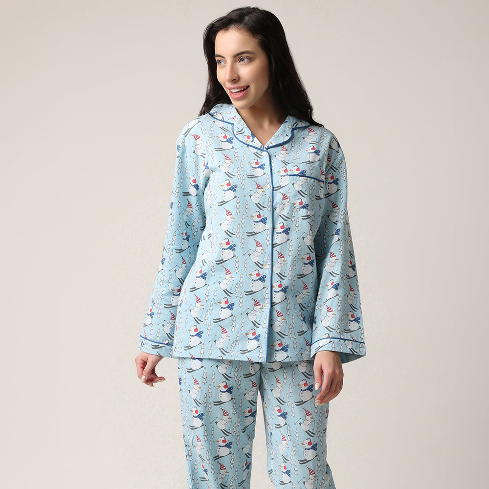 Jolly snowmen skiing through a forest of quirky white trees, all set on a frosty blue background. With cheery hats and polka-dot scarves flying, it's a snowy adventure full of winter fun!