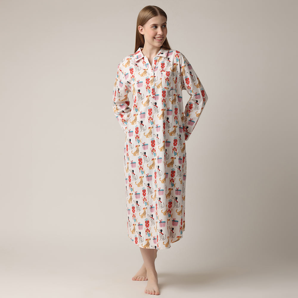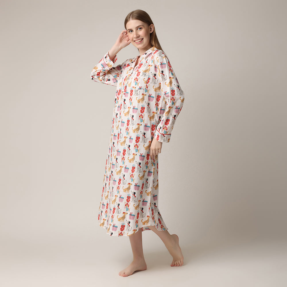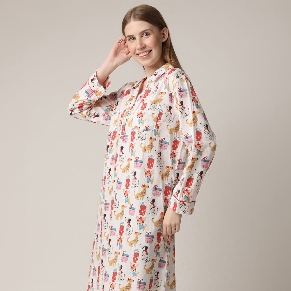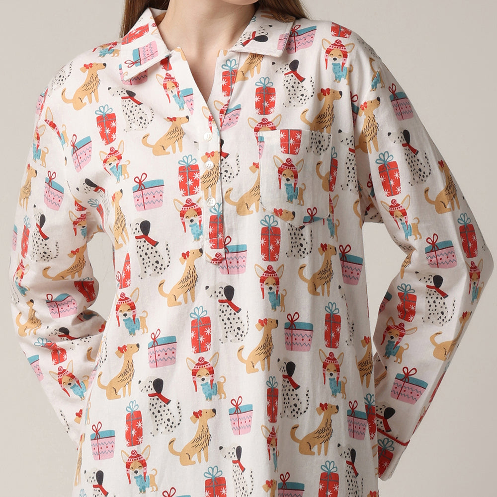 This cheerful holiday print is a pup-lover's dream! Adorable dogs in scarves and hats frolic among colorful gift boxes in red, pink, and teal—spreading tail-wagging festive joy!