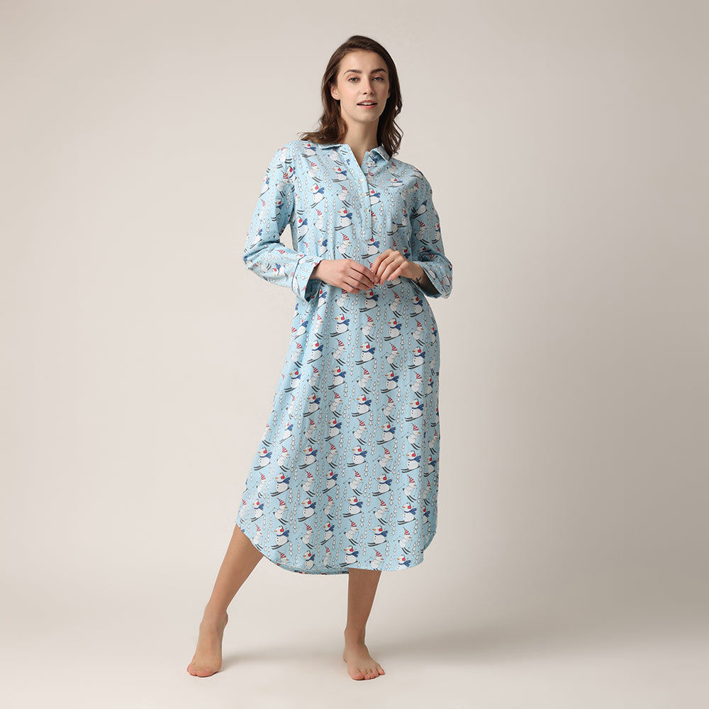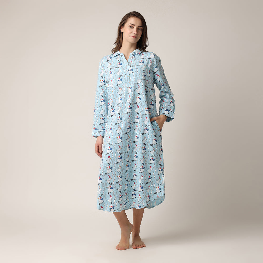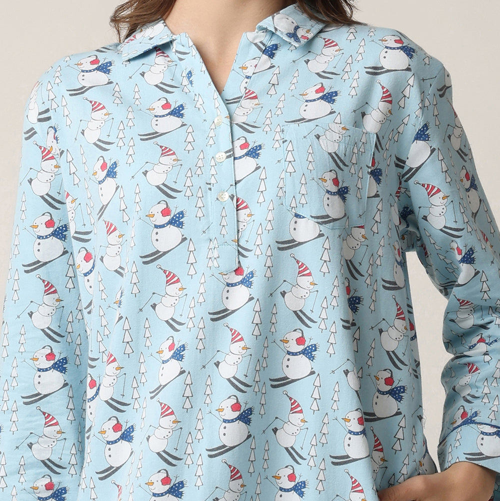 Jolly snowmen skiing through a forest of quirky white trees, all set on a frosty blue background. With cheery hats and polka-dot scarves flying, it's a snowy adventure full of winter fun!