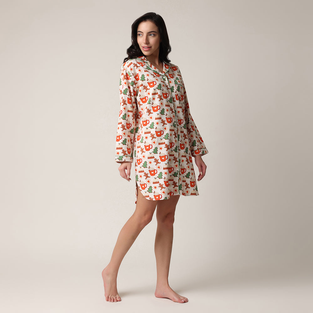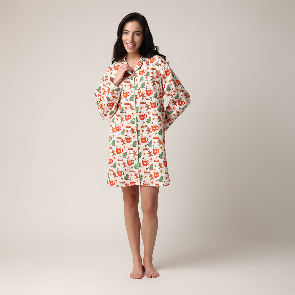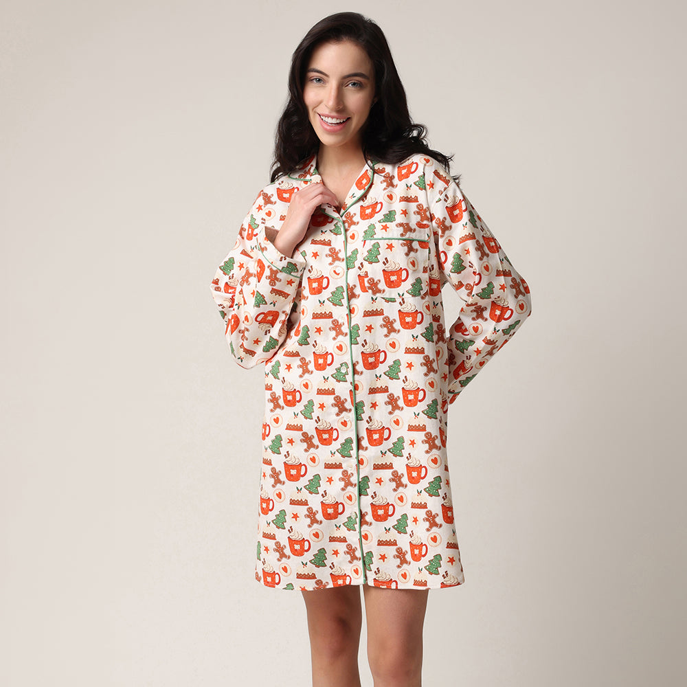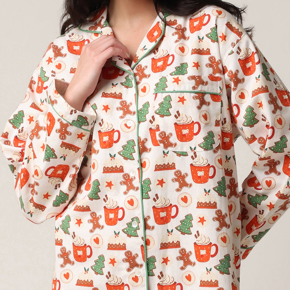 This festive print is a holiday hug! Gingerbread buddies, cocoa mugs, Christmas trees, stars, and sweet treats dance all over in cozy, merry cheer.