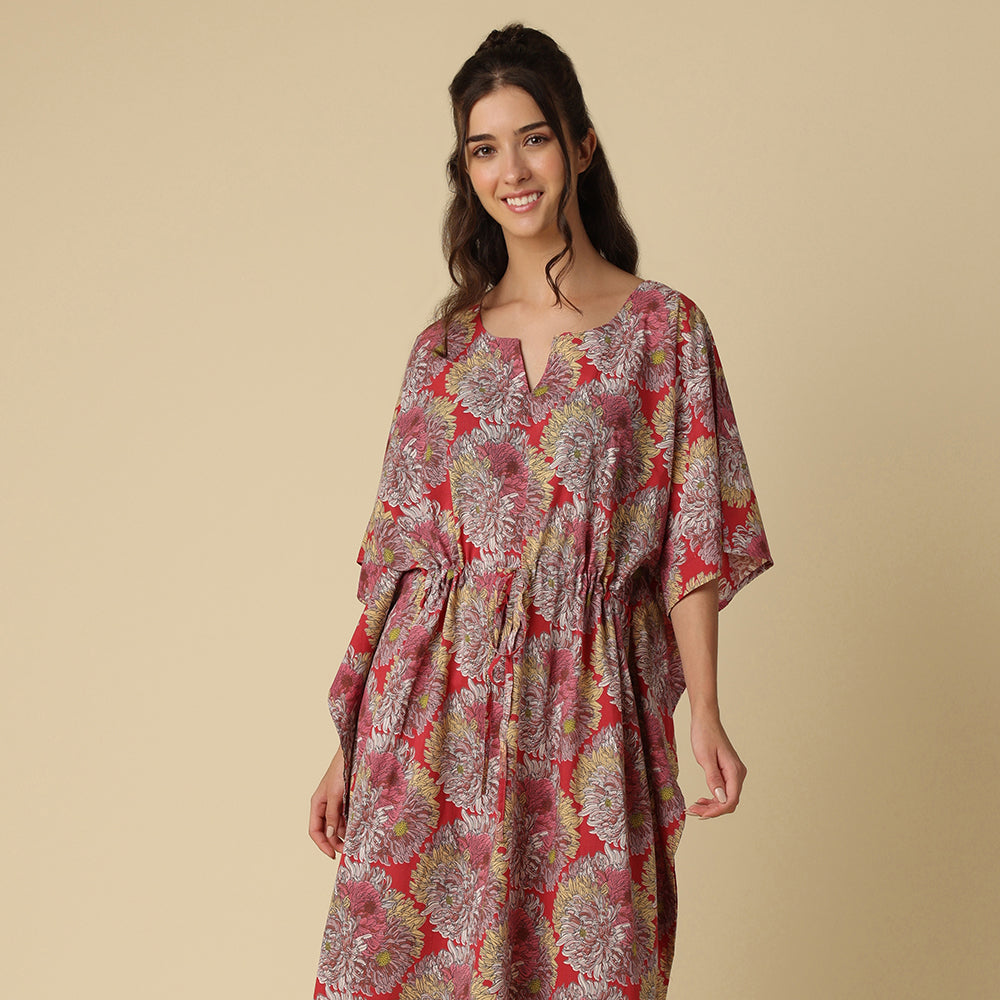 This lively print bursts with oversized, fluffy chrysanthemums in pink, yellow, and white, dancing across a bold fuschia backdrop—like a flower party in full bloom!