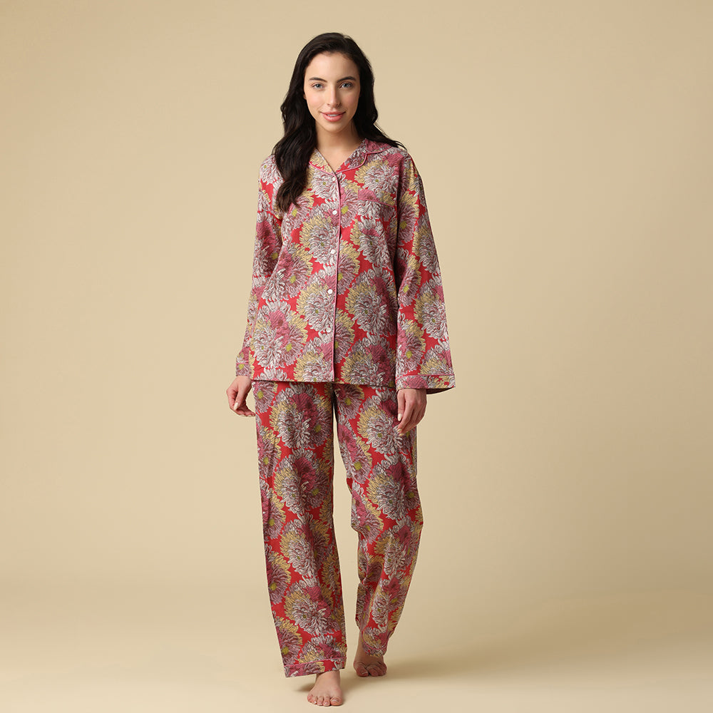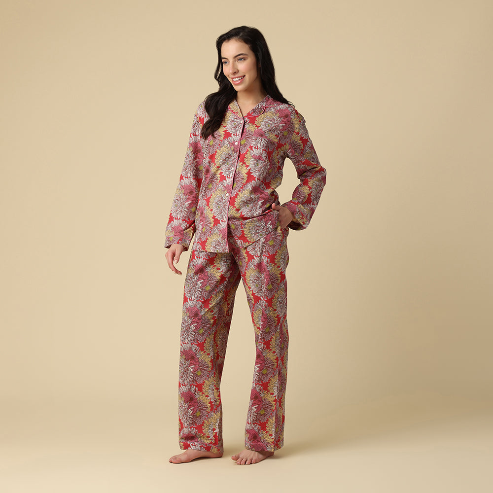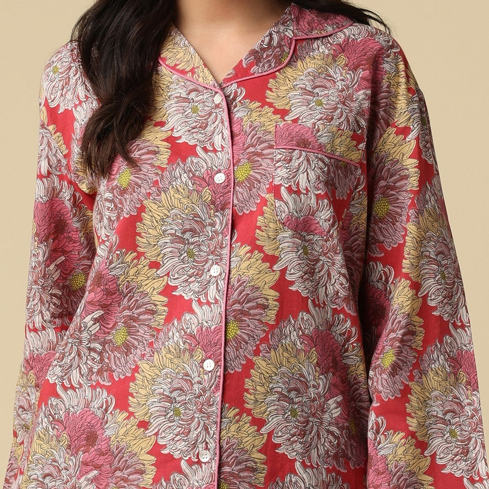 This lively print bursts with oversized, fluffy chrysanthemums in pink, yellow, and white, dancing across a bold fuschia backdrop—like a flower party in full bloom!
