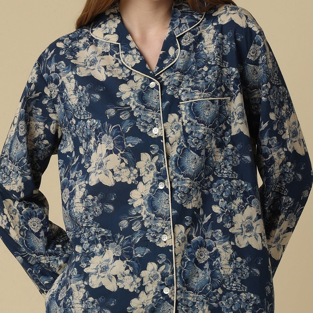 A flirty bouquet of indigo and ivory blooms twirls across a deep navy backdrop—like a midnight garden throwing a secret party under the stars!