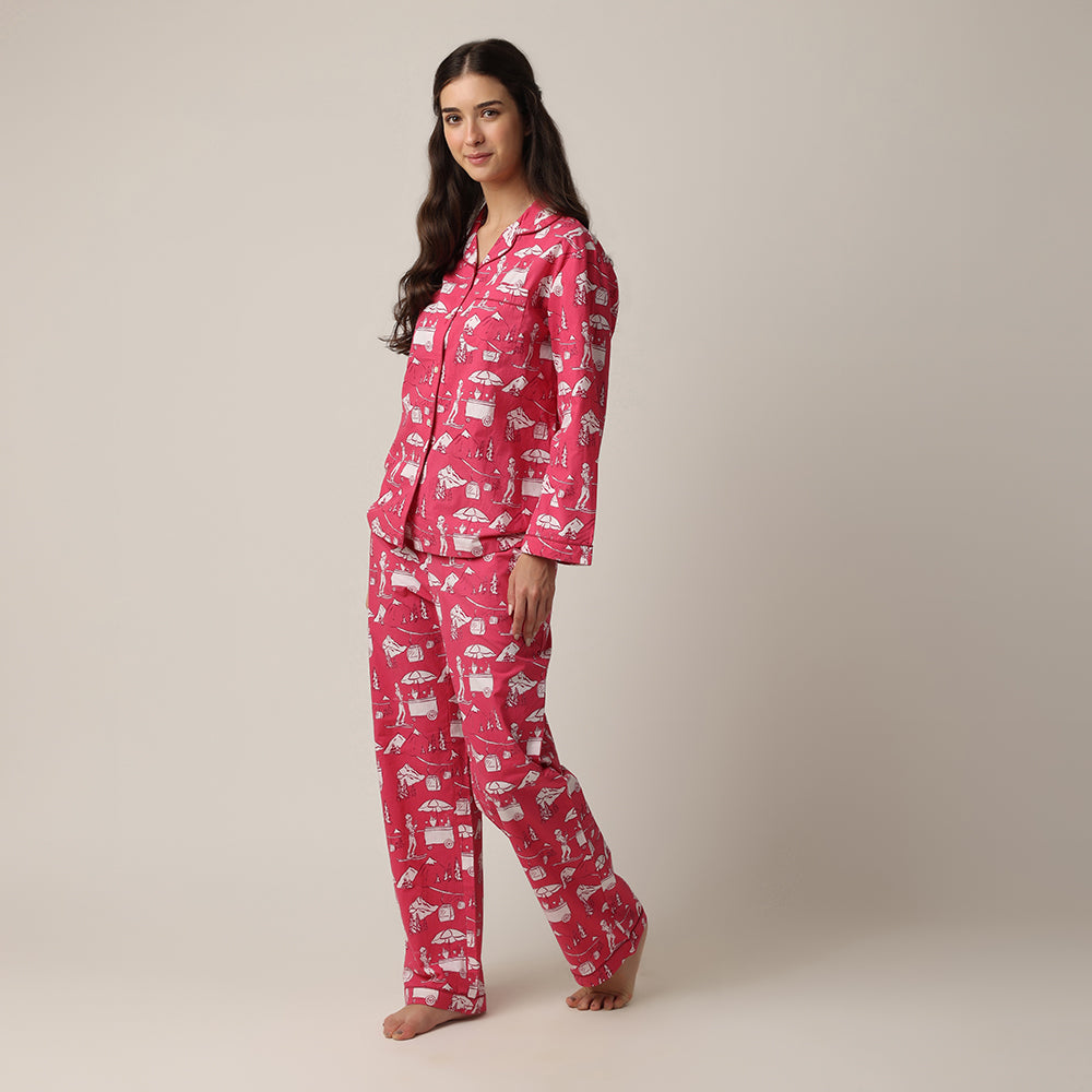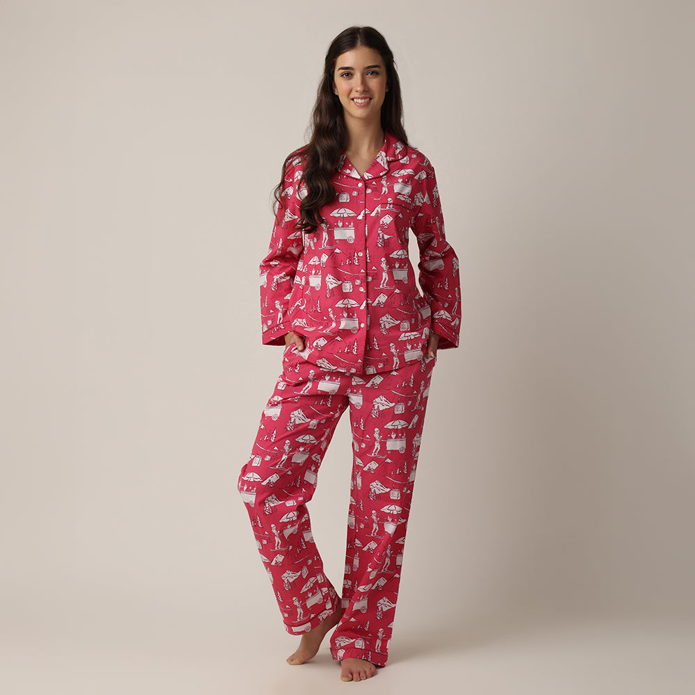 This playful print is a snowy daydream—skiers, cable cars, and hot cocoa carts scattered across a bold berry red backdrop make it feel like a cozy mountain escape!