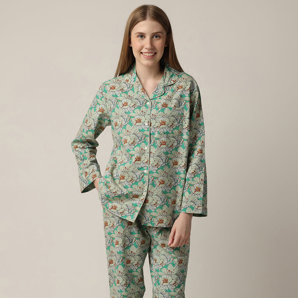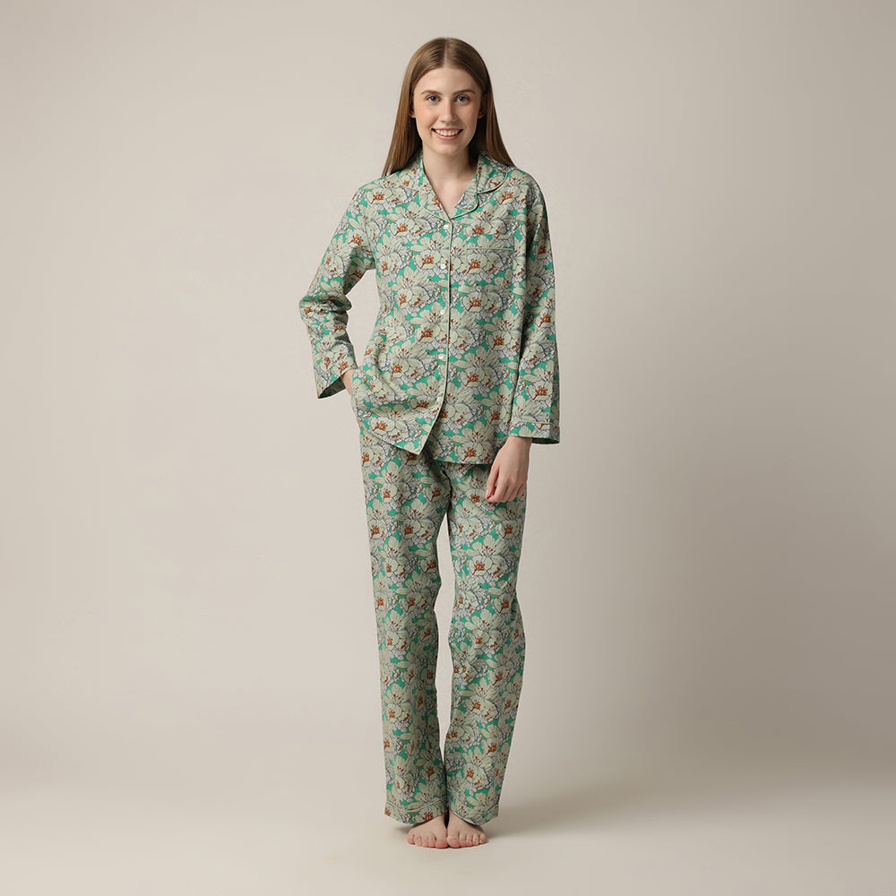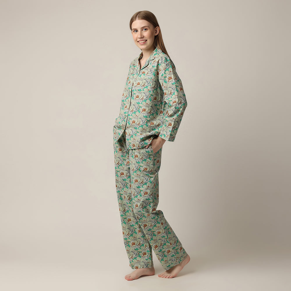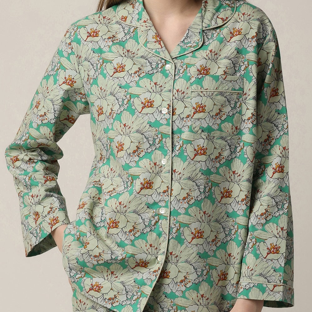 This playful print pops with oversized pale blooms and bursts of orange and yellow, all set against a vibrant aqua-green backdrop—like a tropical garden party in full swing!