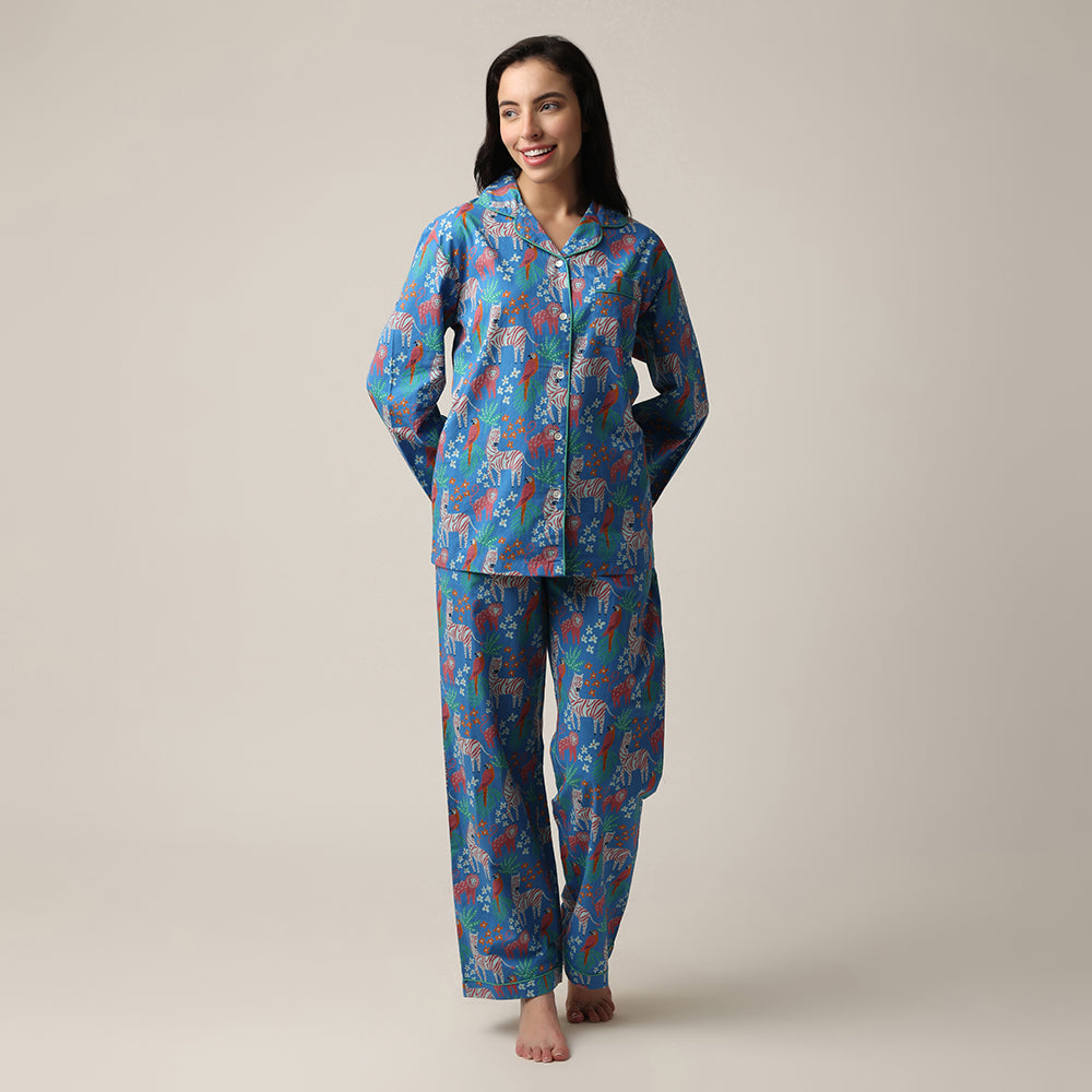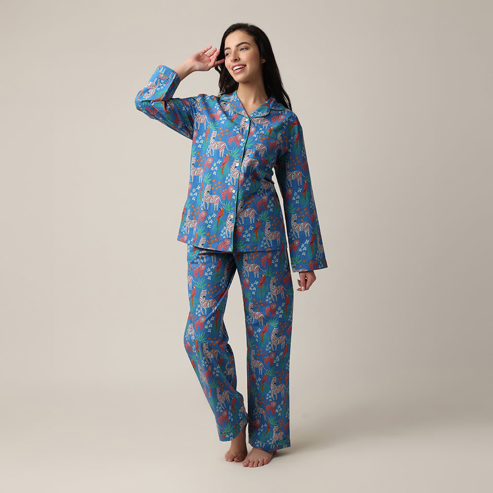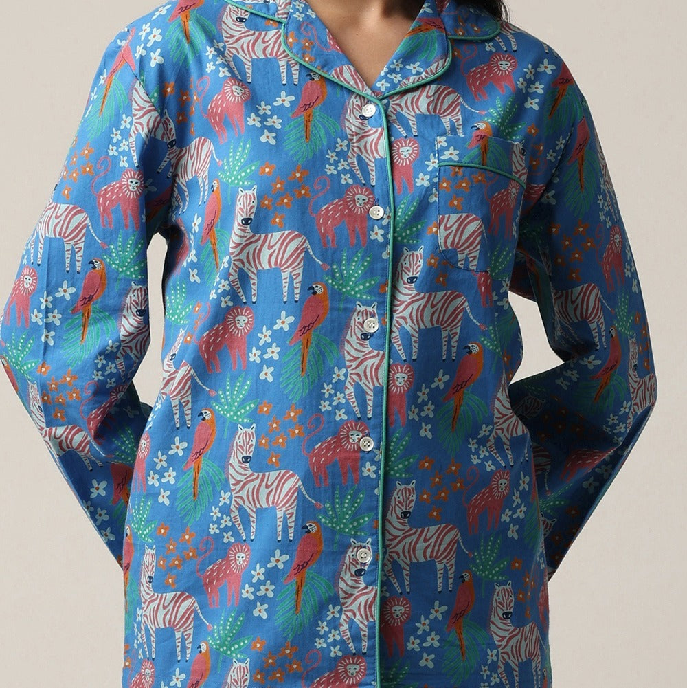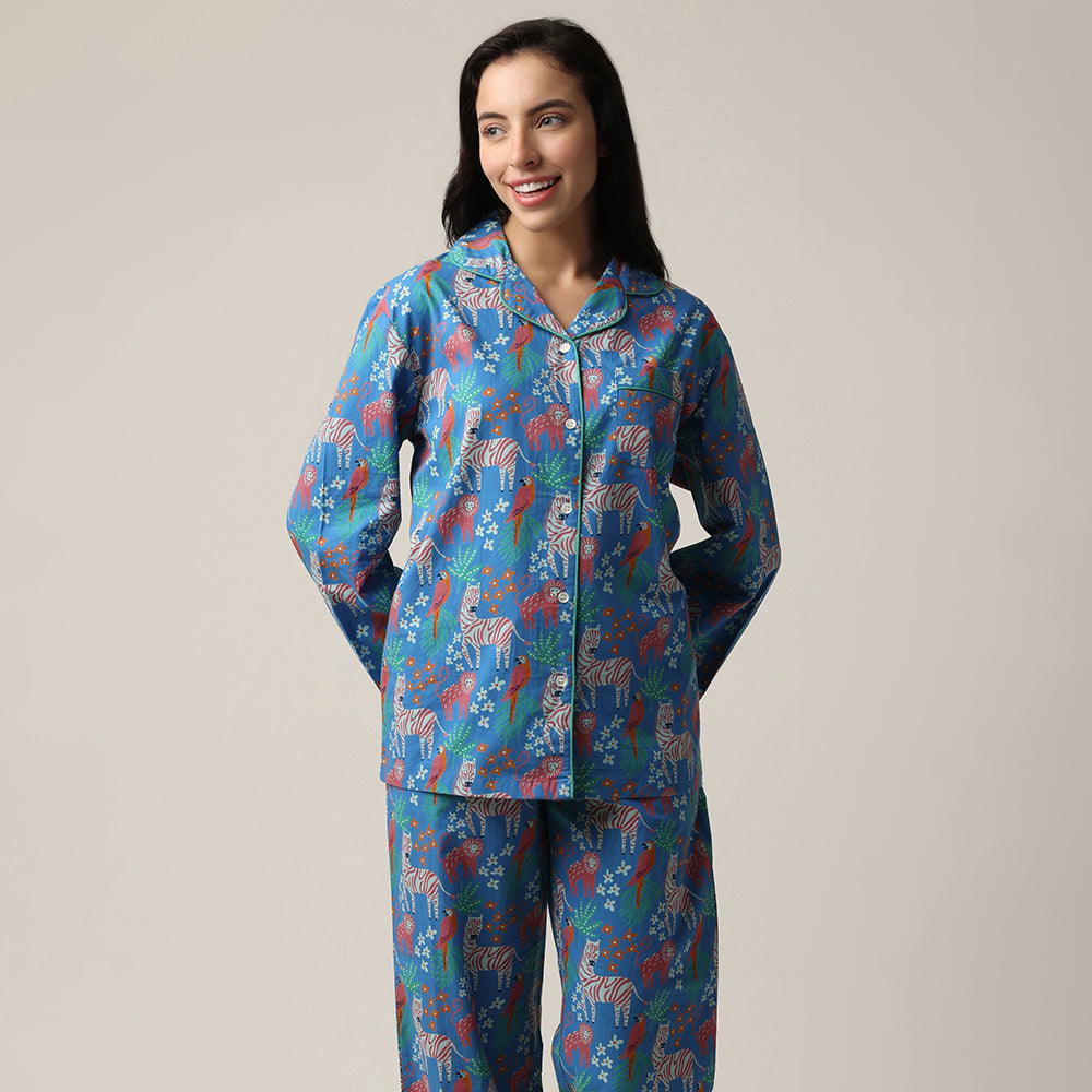 This print is a jungle jam! Stripy zebras, happy lions, and bright parrots party among colorful blooms on a bold blue background—wild fun all around!